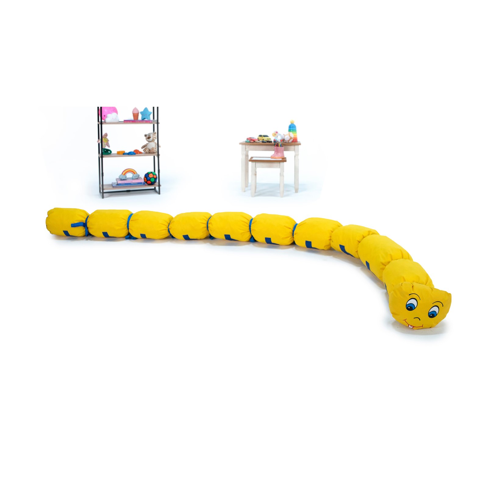 Centopeia de passeio com 300 centímetros de comprimento e 30 centímetros de diâmetro, confeccionada em bagum com recheio de espuma em flocos, na cor amarela e com tirantes para 20 lugares na cor azul.
